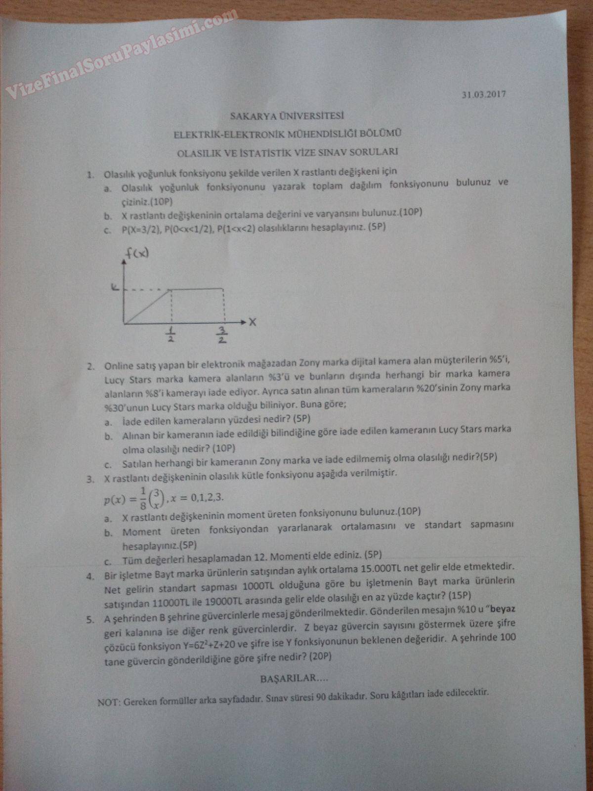 Vize ve Final Soruları / Sakarya Üniversitesi / Olasılık ve İstatislik Dersi
