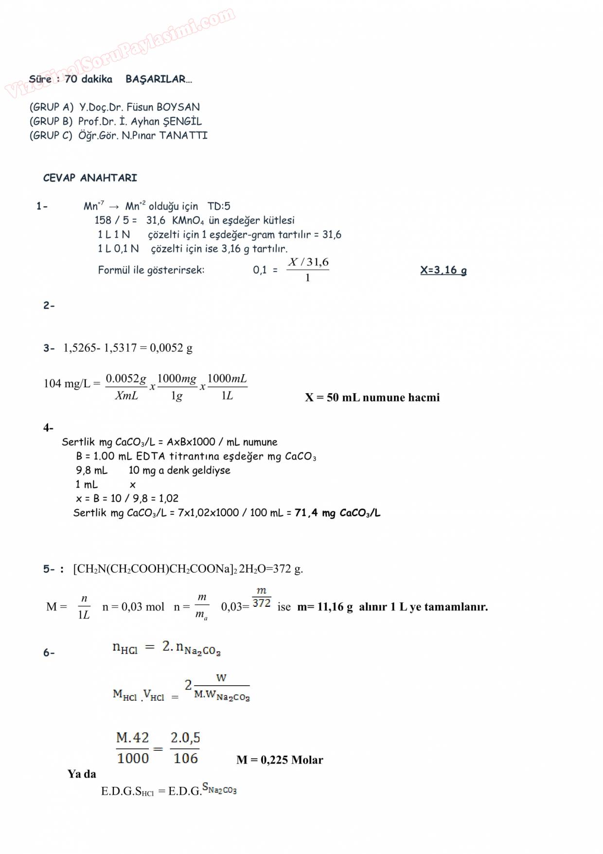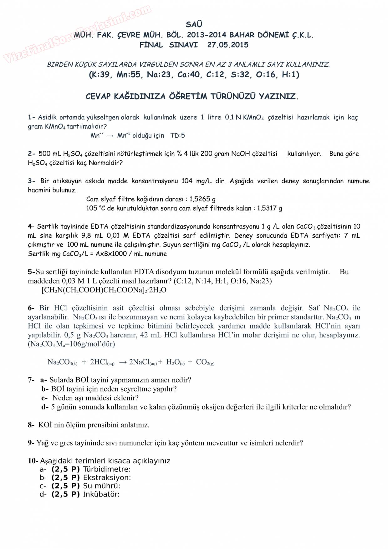 Vize ve Final Soruları / Sakarya Üniversitesi / Çevre Kimyası II