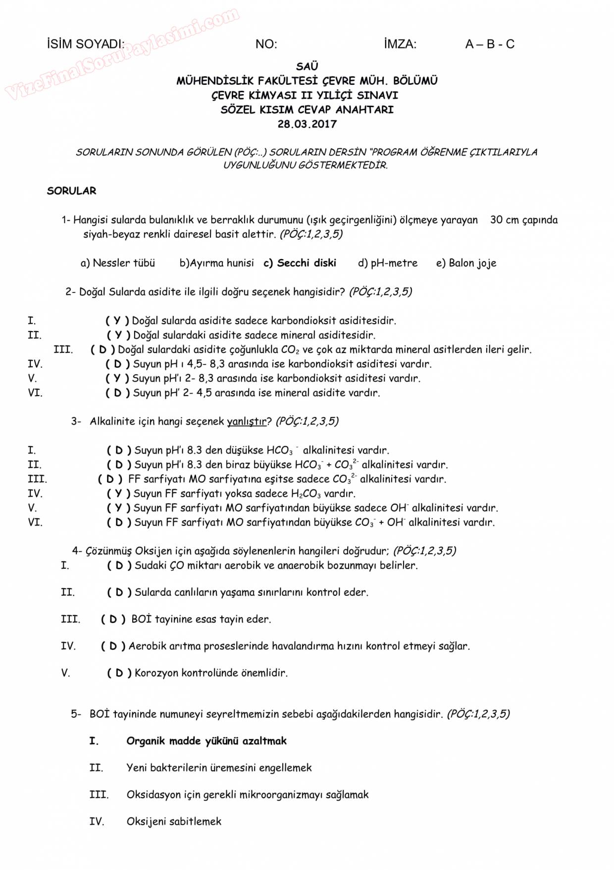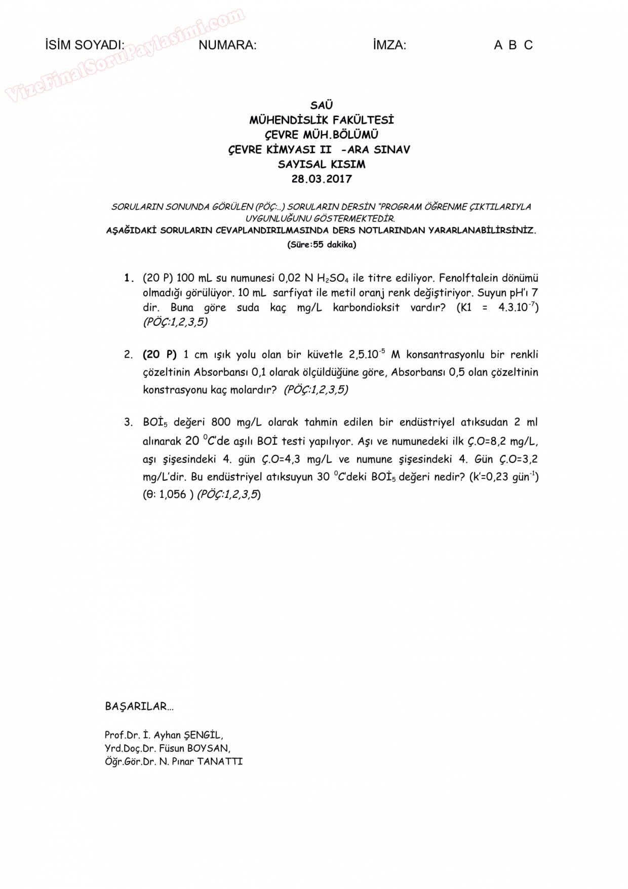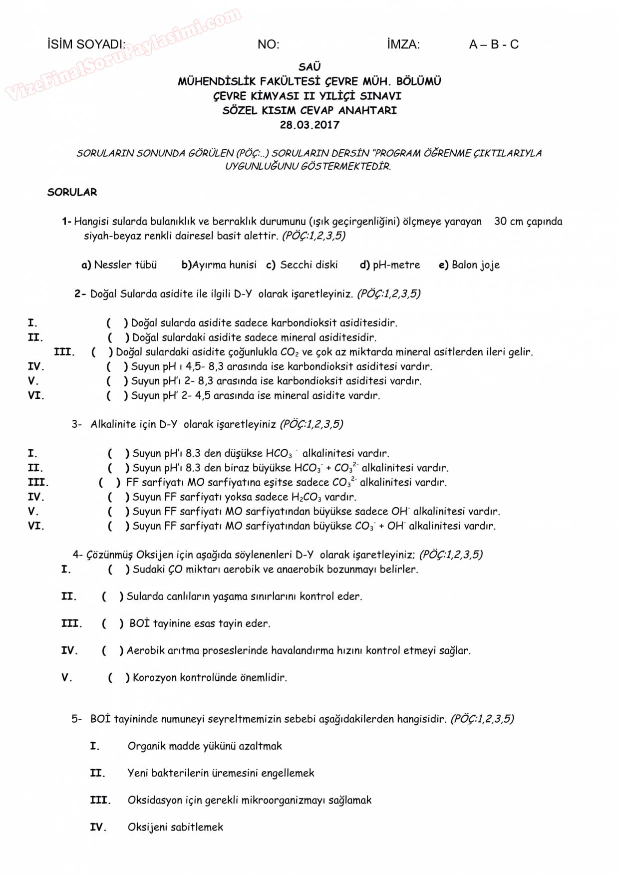 Vize ve Final Soruları / Sakarya Üniversitesi / Çevre Kimyası II