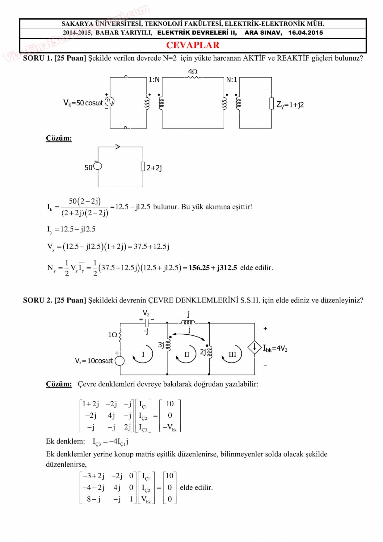 Vize ve Final Soruları / Sakarya Üniversitesi / Elektrik Devreleri-2