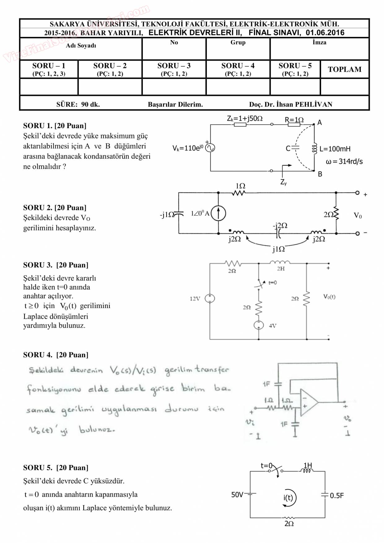 Vize ve Final Soruları / Sakarya Üniversitesi / Elektrik Devreleri-2