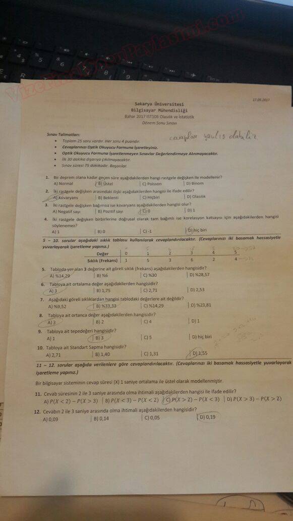 Olasılık ve İstatistik Vize Soruları 28-11-2016, 16:00