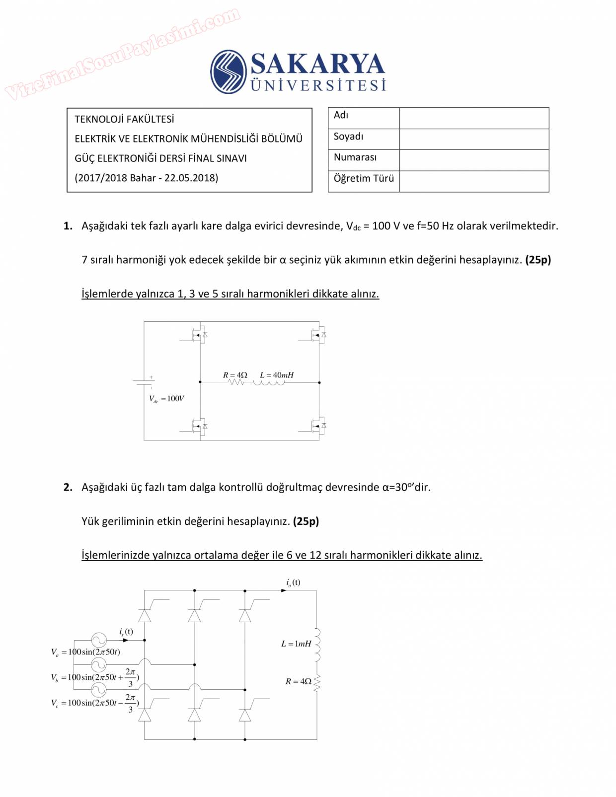 Vize ve Final Soruları / Sakarya Üniversitesi / Güç Elektroniği Dersi