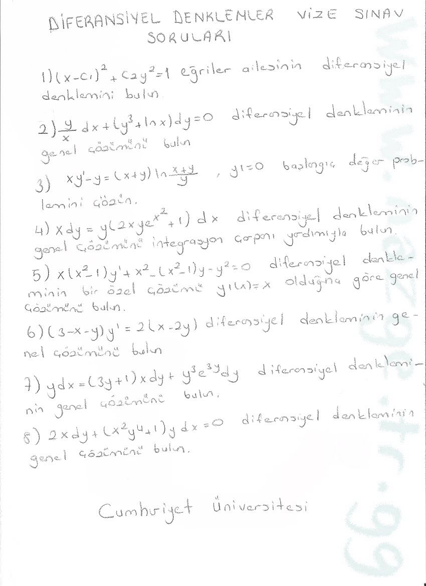 Vize ve Final Soruları / Cumhuriyet Üniversitesi / Diferansiyel Denklemler