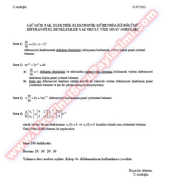 Vize ve Final Soruları / Sakarya Üniversitesi / Diferansiyel Denklemler