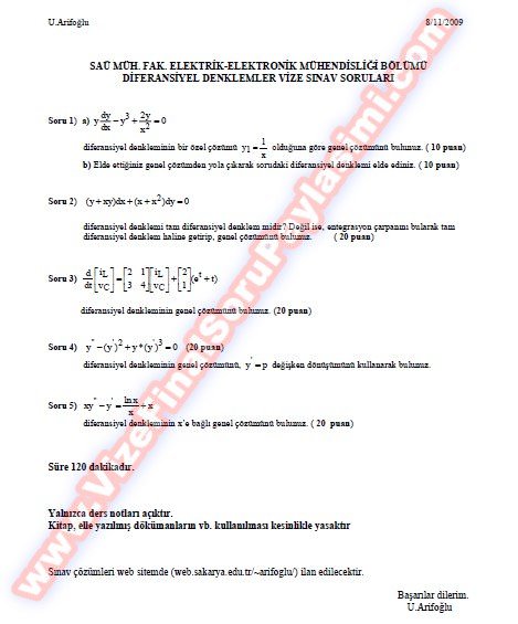 Vize ve Final Soruları / Sakarya Üniversitesi / Diferansiyel Denklemler