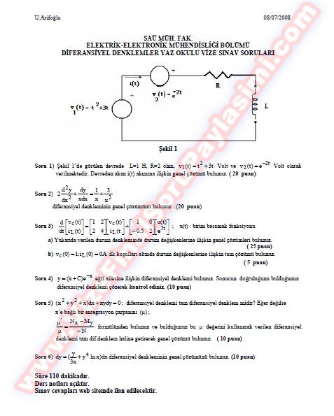 Vize ve Final Soruları / Sakarya Üniversitesi / Diferansiyel Denklemler