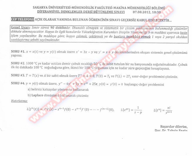 Mühendislik Matematiği (Diferansiyel Denklemler) Vize Soruları - 28.04.2012 20-07-2014, 22:03