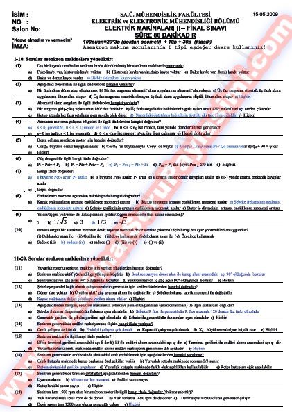Elektrik Makinaları-2 Final Soruları Ve Cevapları - 15.05.2009