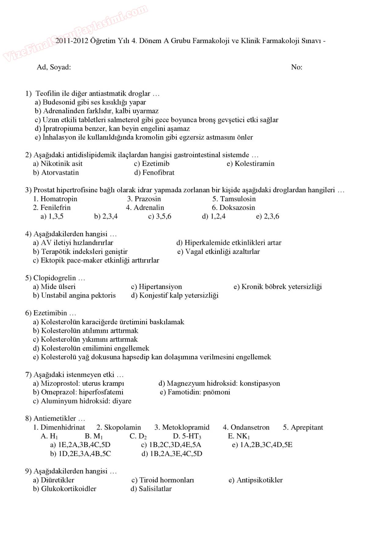 farmakoloji klinik farmakoloji vize final sınav soruları GERİ DÖN-