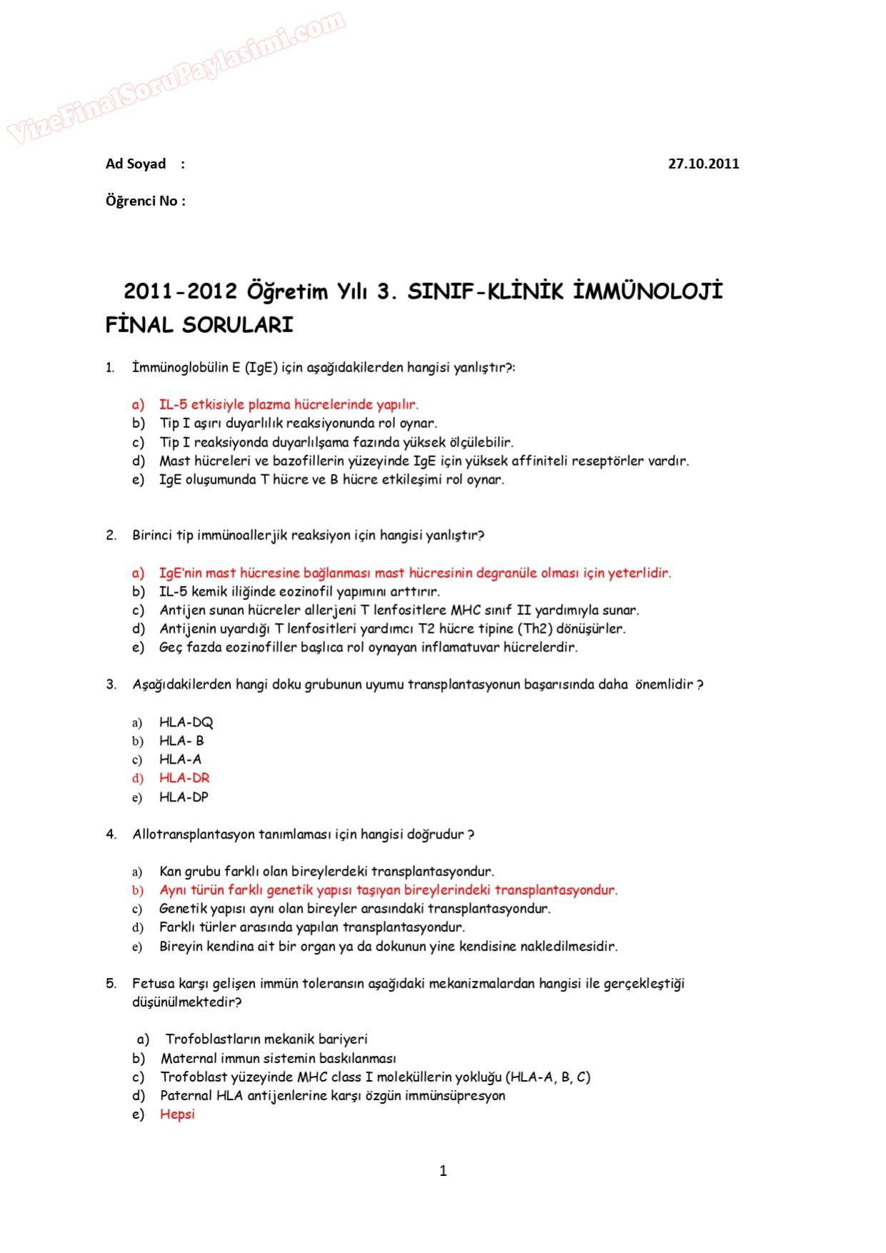 Vize ve Final Soruları / İstanbul Üniversitesi / Klinik İmmünoloji Sınav Soruları