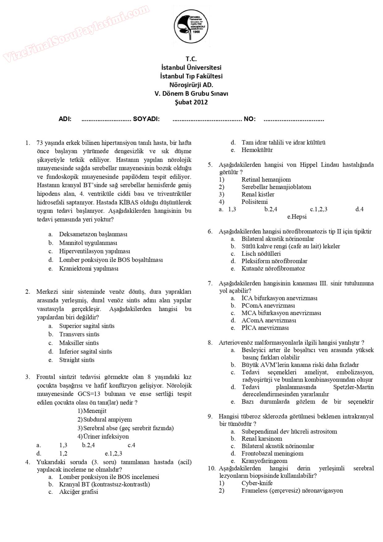 Vize ve Final Soruları / İstanbul Üniversitesi / Nöroşirürji Dersi