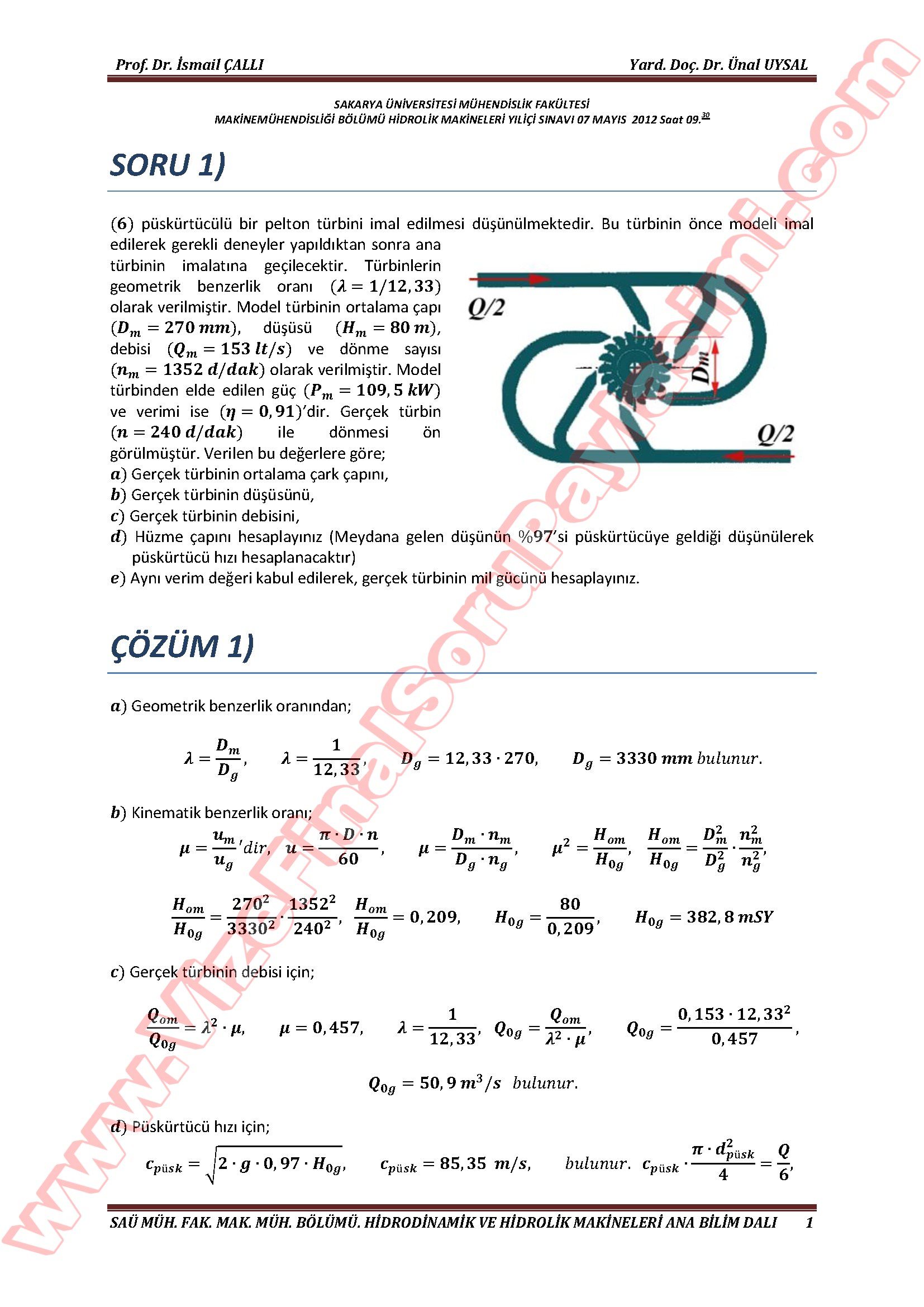 Vize ve Final Soruları / Sakarya Üniversitesi / Hidrolik Makinaları Dersi
