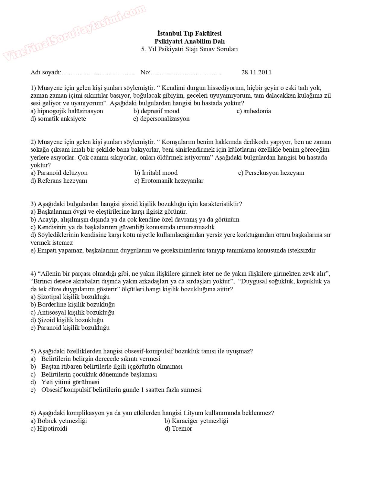 psikiyatri stajı sınav vize final sınav soruları GERİ DÖN-