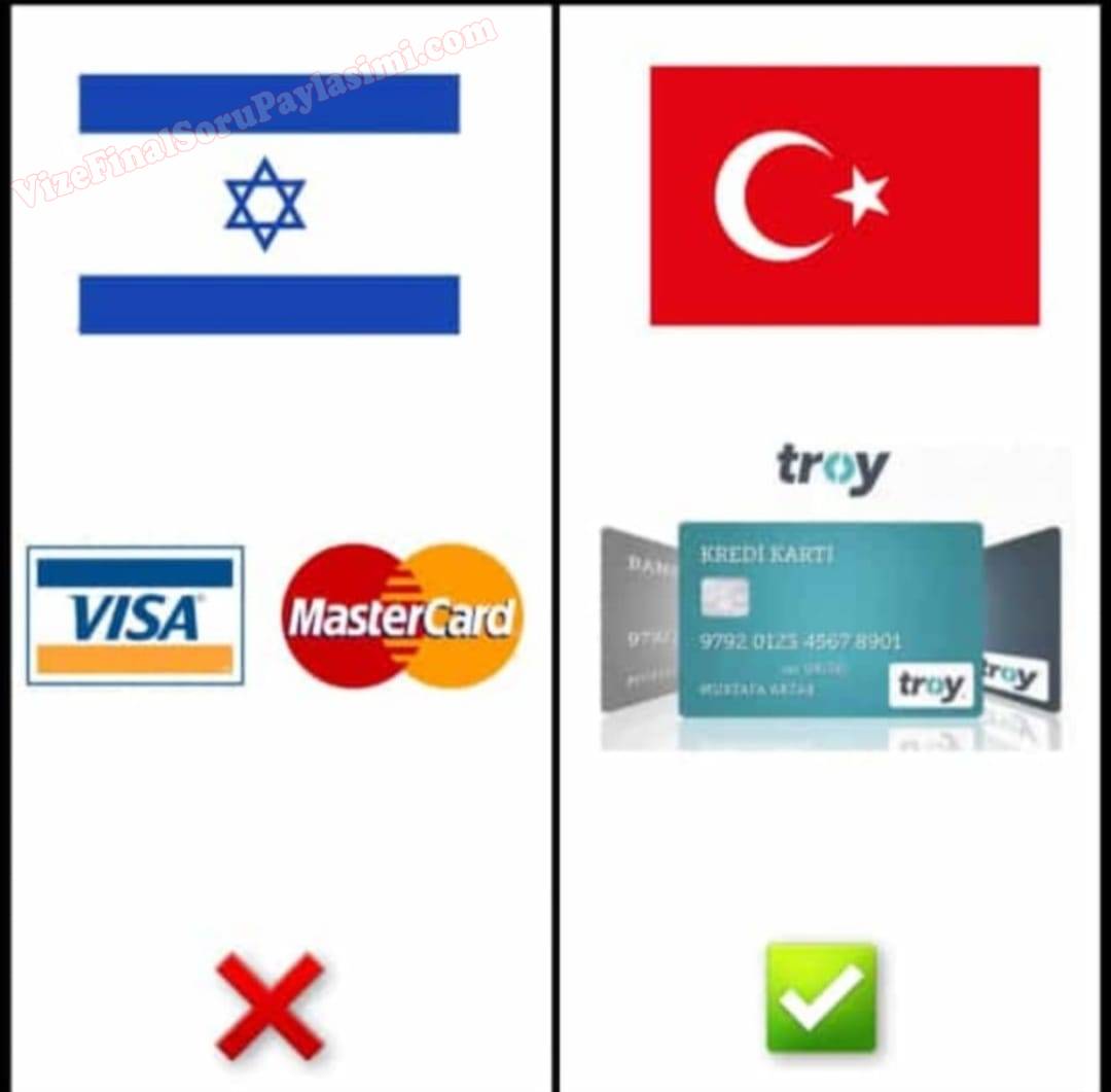 Troy'un Açılımı "Türkiye'nin Ödeme Sistemi" dir. Bu yerli ödeme sistemi; bankalar ve işletmeler arası para akışını sağlayan elektronik bankacılık yöntemi olarak kullanılır. Troy logolu kredi ve banka kartlarını kullanarak kredi kartlarından yapılan her bir işlem için alınan komisyonların İsrail'e destek veren şirketlere gitmesini önleyebilirsin...