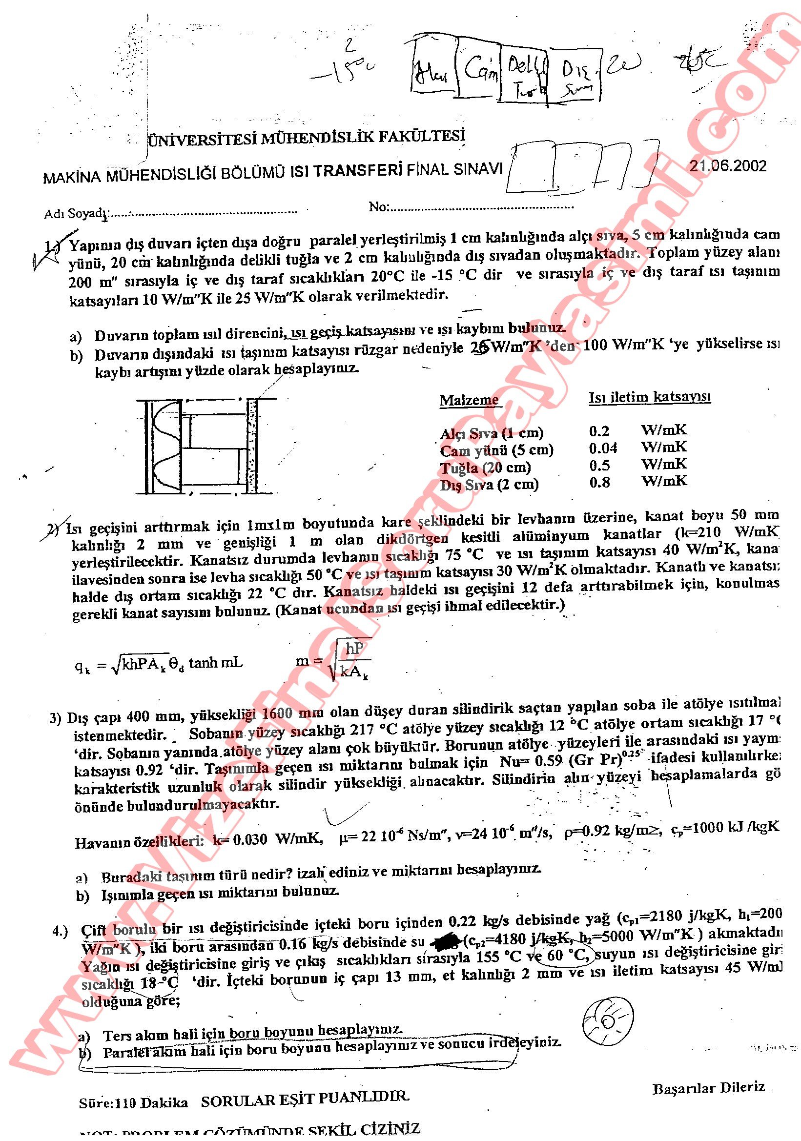 Vize ve Final Soruları / Sakarya Üniversitesi / Isı Geçişi Dersi