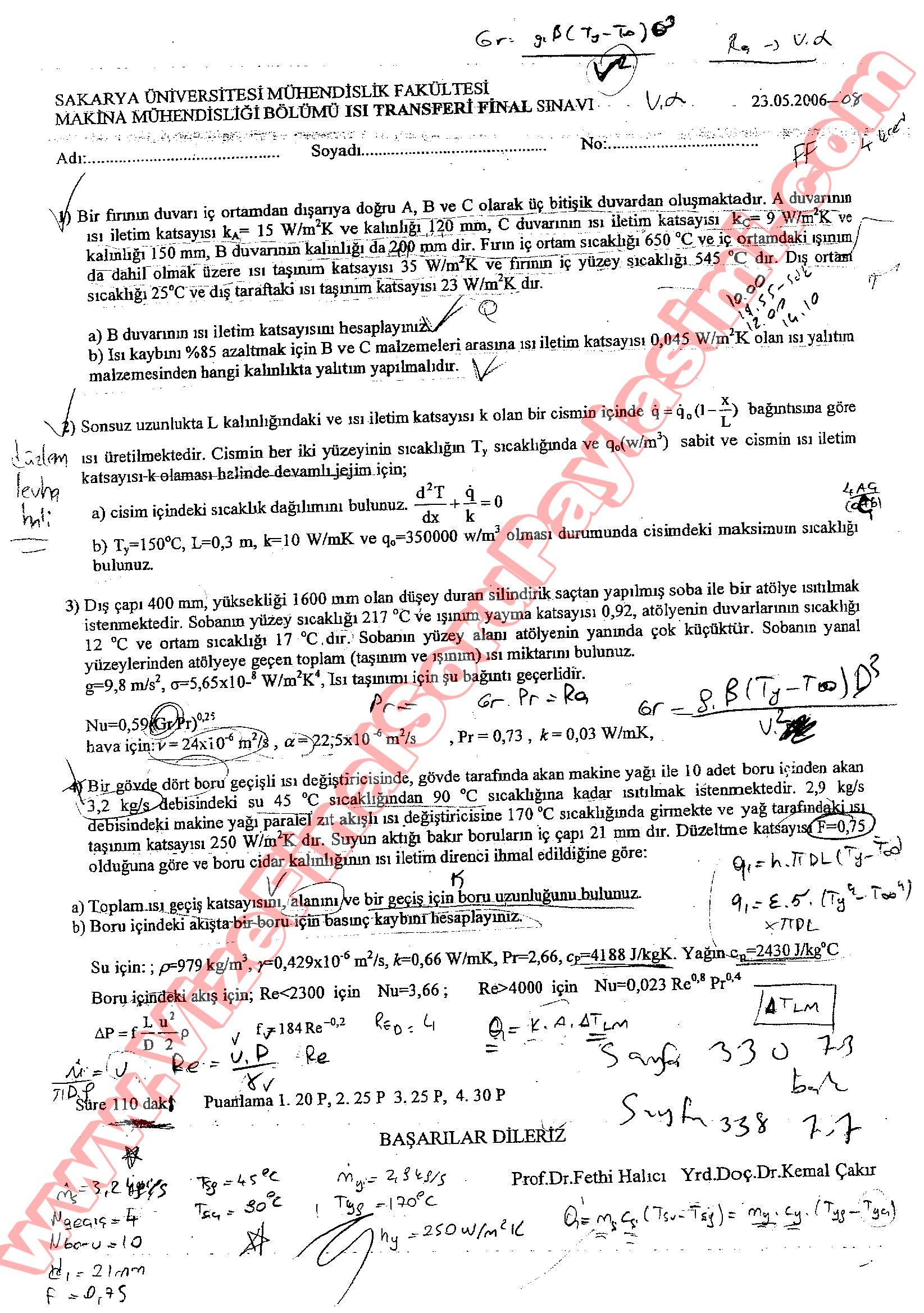 Vize ve Final Soruları / Sakarya Üniversitesi / Isı Geçişi Dersi