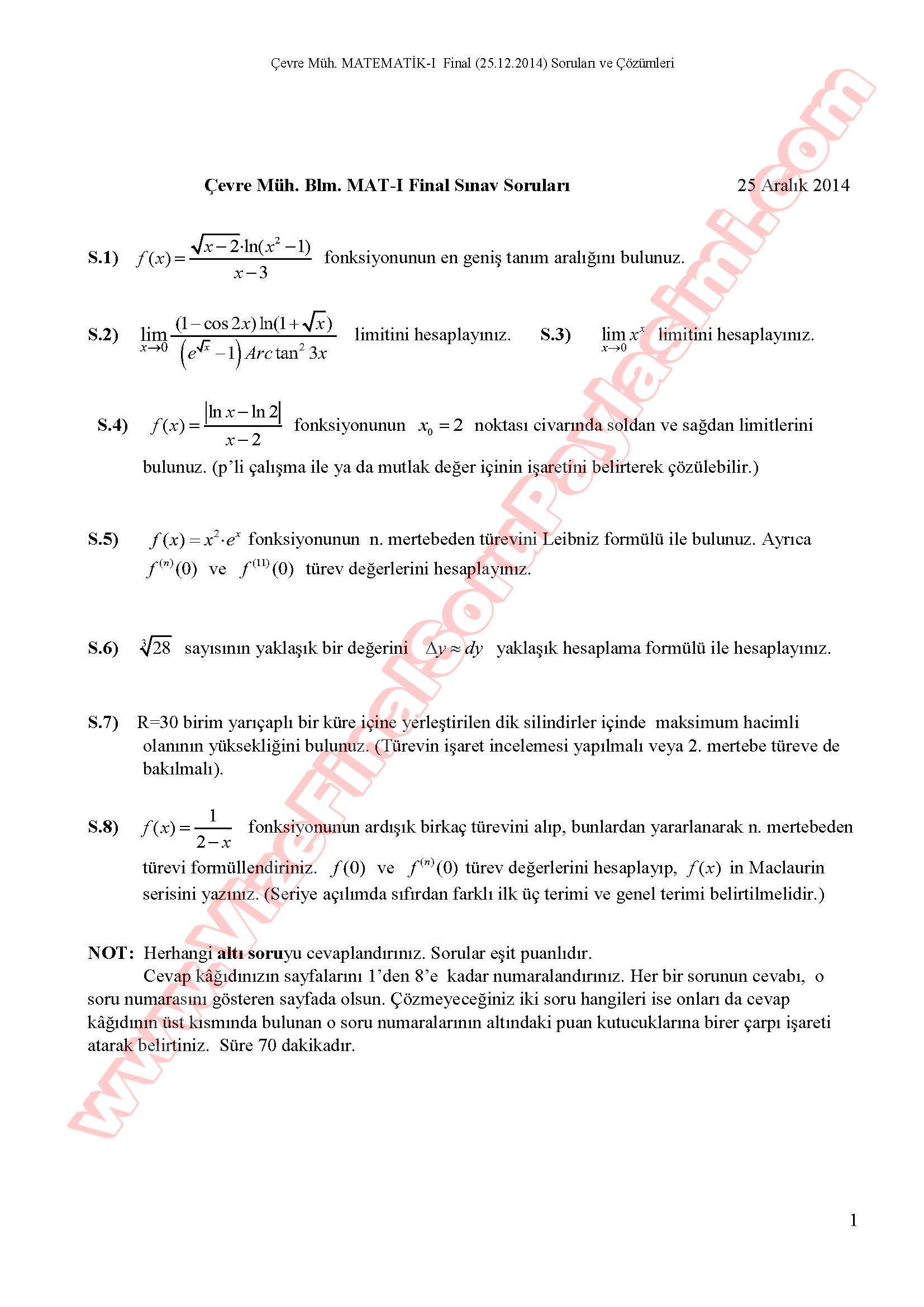 Matematik-1 Final Soruları Ve Cevapları - 25.12.2014