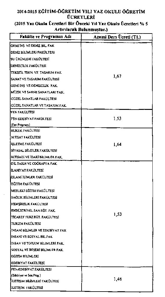 2015 yaz okulu ucretleri firat pamukkale istanbul tunceli kocaeli uni universite