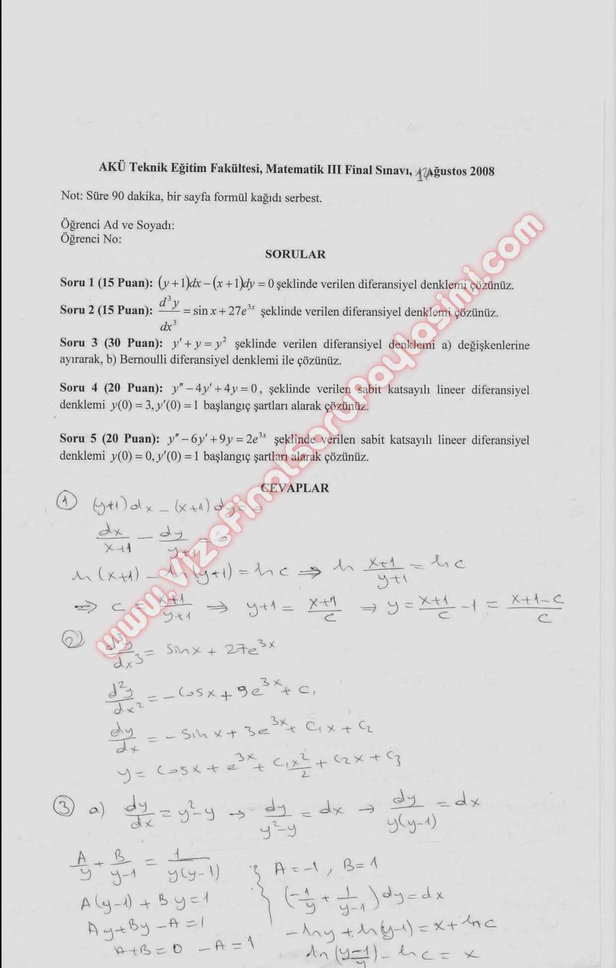 Matematik 3 Yaz Okulu Final Soruları -2008