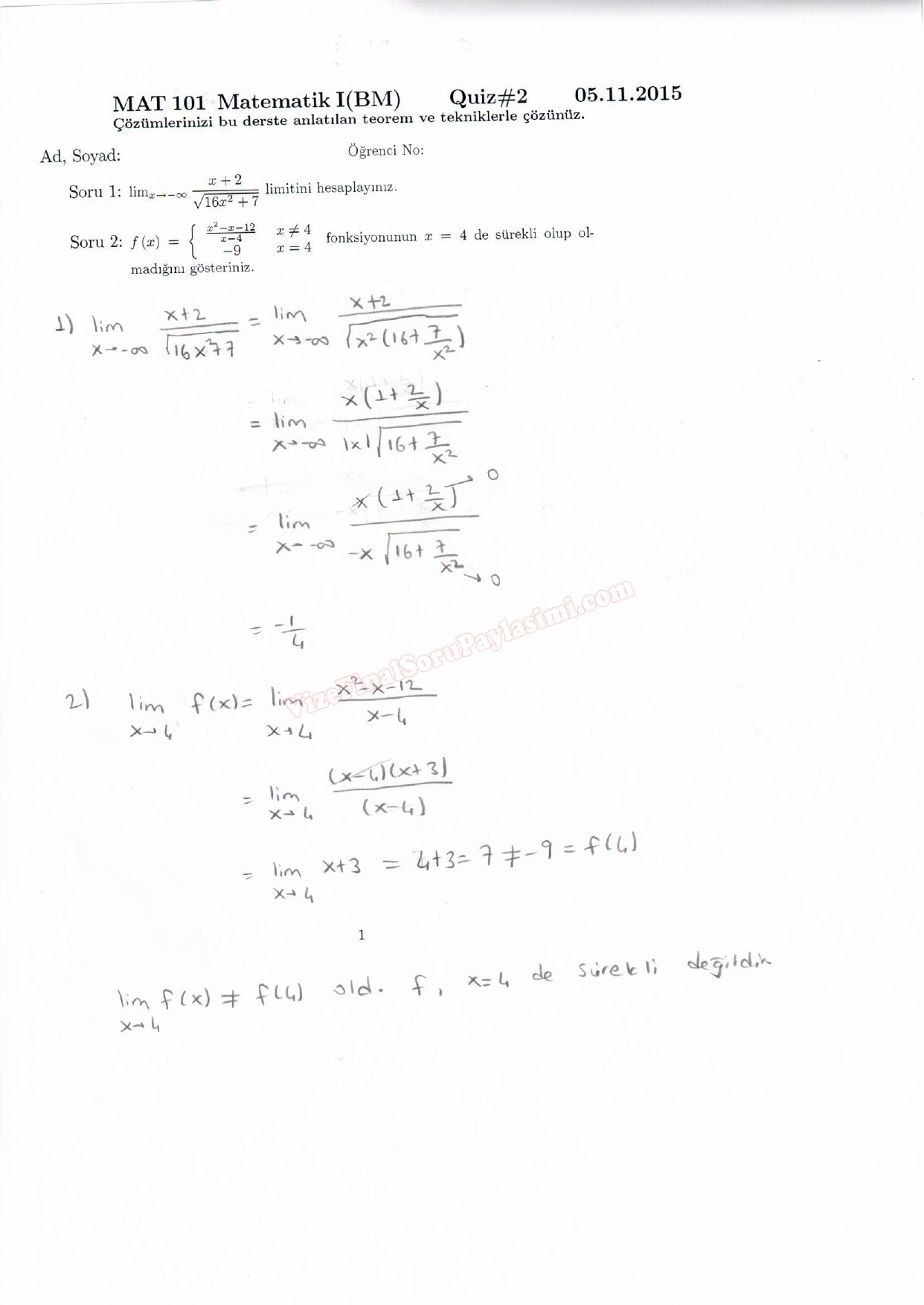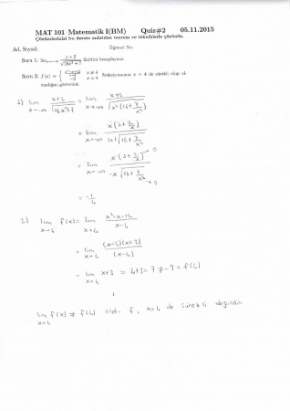 Matematik -1 2. Quiz Soru ve Çözümleri - EEM 17-12-2015, 16:20