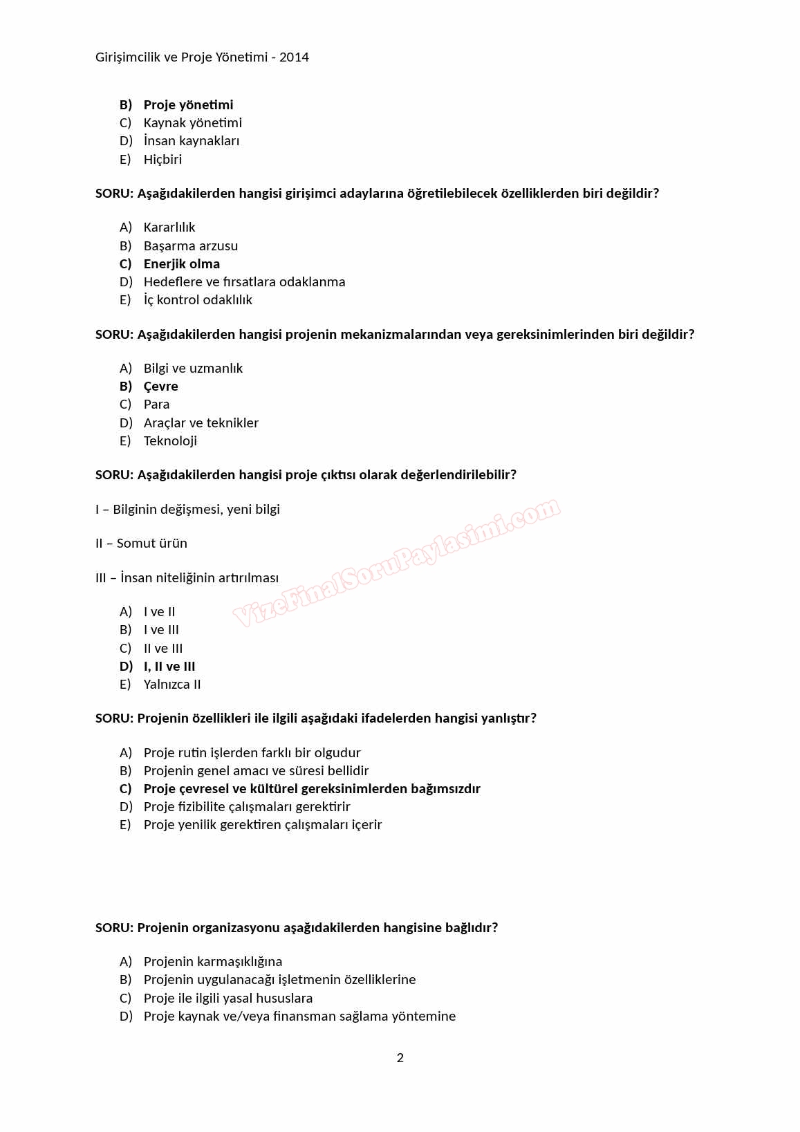 Girişimcilik ve Proje Yönetimi Çalışma Soruları