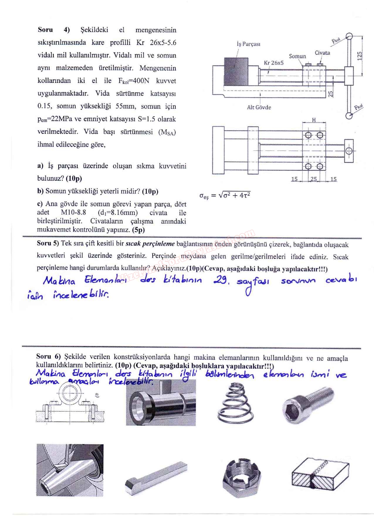 sdu Süleyman Demirel Üniversitesi Makine Elemanları -1 final soruları cevapları sınav soruları 2018