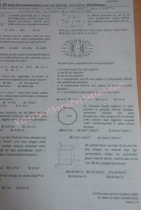 Fizik -2 Vize Soruları 2016 Fırat Üniversitesi Mühendislik Fakültesi