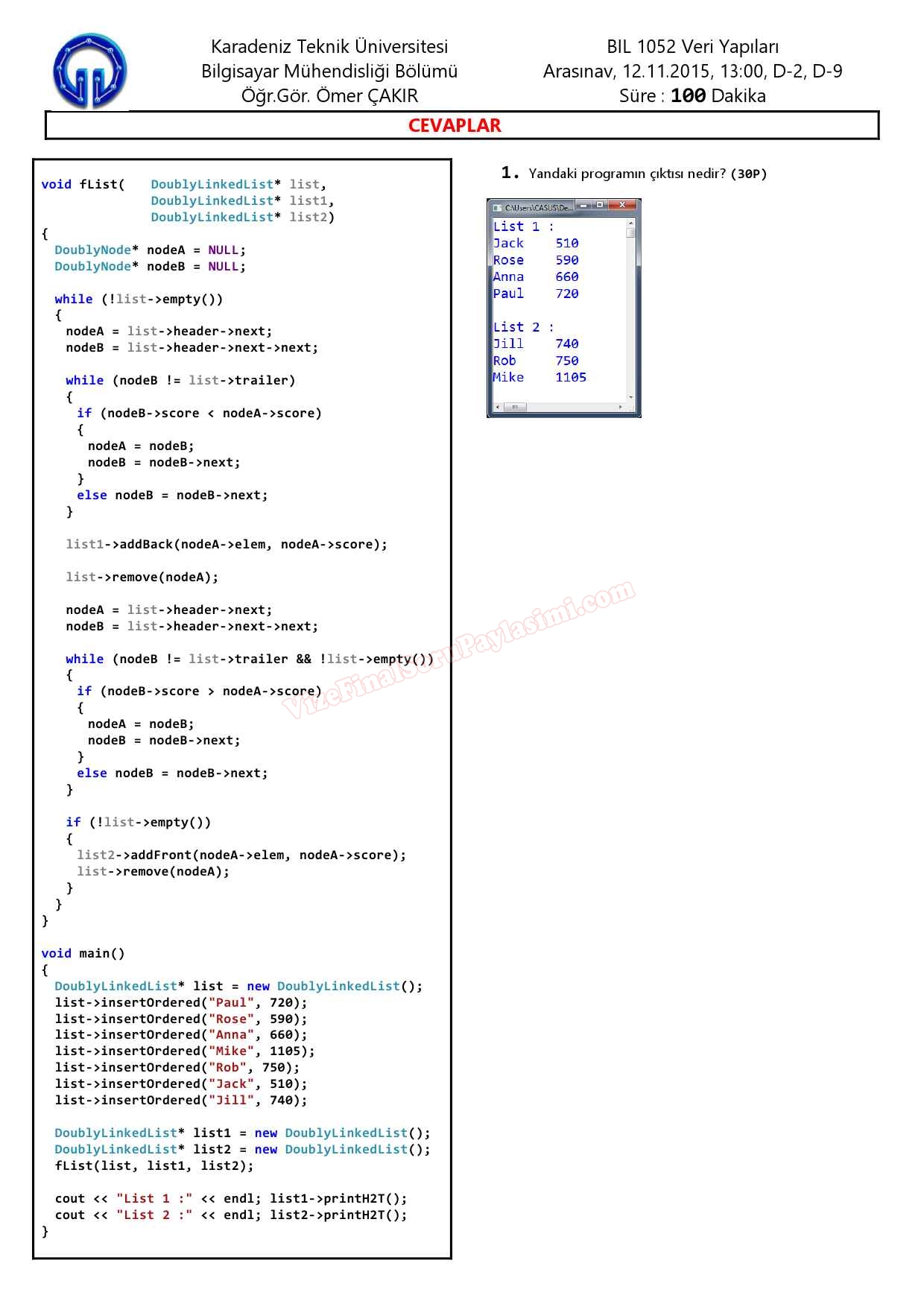 Veri Yapıları Dersi Vize Soruları Karadeniz Teknik Üniversitesi 2015 ktu