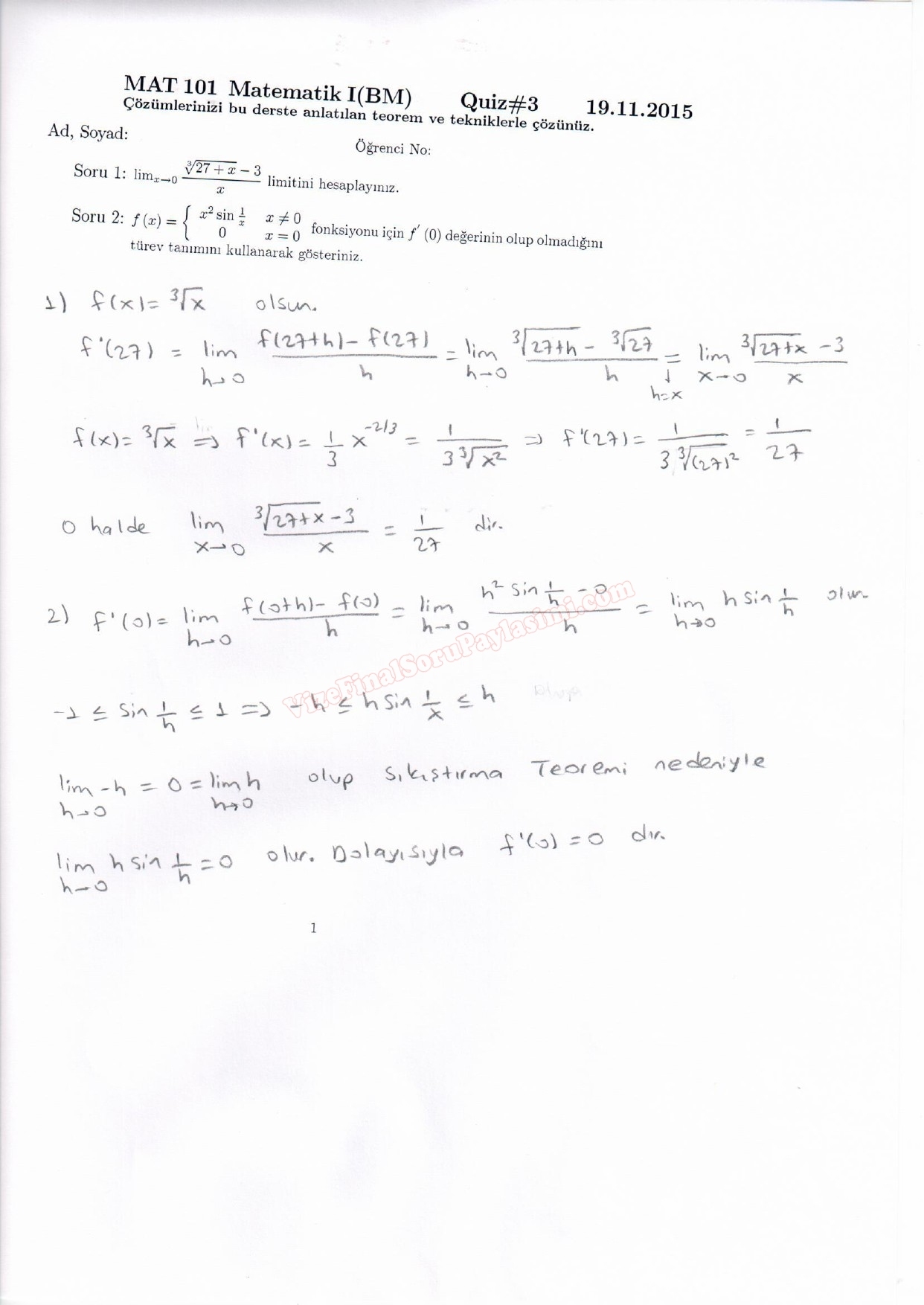 Matematik -1 Dersi Quiz Soruları ve Çözümleri 3-04-2018, 22:06