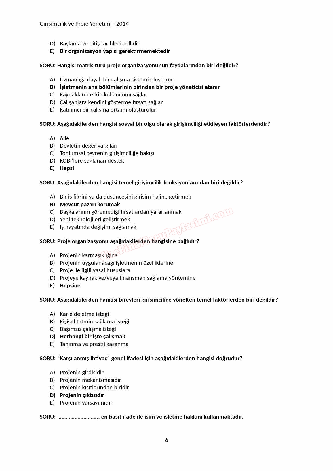 Girişimcilik ve Proje Yönetimi Çalışma Soruları