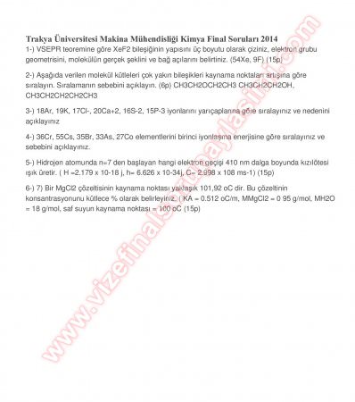 Kategori: Vize ve Final Soruları / Trakya Üniversitesi / Kimya Dersi